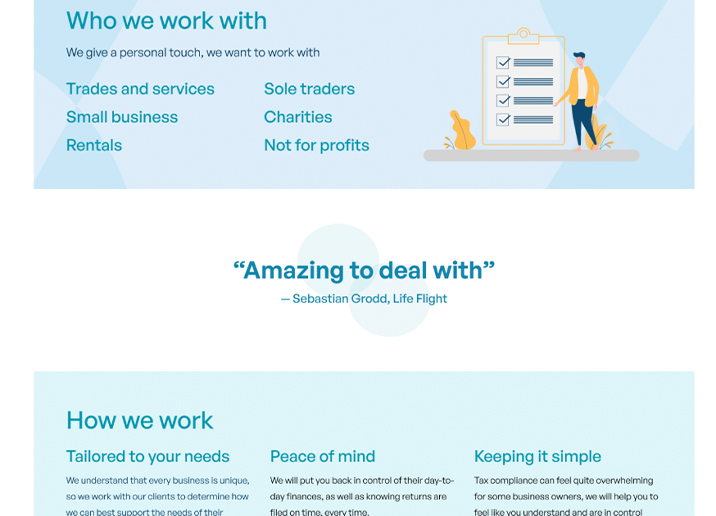 This new site is a one pager covering of key information for potential clients. Alongside the design, Jarrid worked with Serenity Accounts to plan out their content and a plan for taking the site from a simple landing page to a one-page site and then through to a full site.